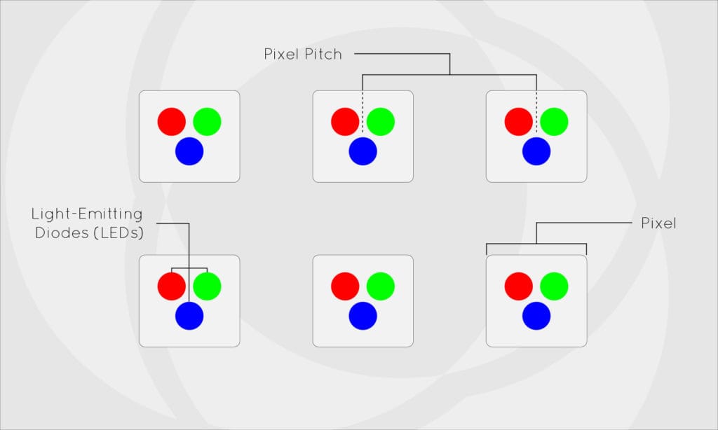 Шаг пикселя, наряду с размером дисплея, напрямую связан с разрешением изображения дисплея. Светодиодные дисплеи состоят из светодиодов красного, зеленого и синего спектра, сгруппированных в кластеры, известные как пиксели. Шаг пикселя описывает плотность пикселей на светодиодном экране и коррелирует с его разрешением. Шаг пикселя, который иногда называют шагом точки, — это расстояние в миллиметрах от центра пикселя до центра соседнего пикселя.
