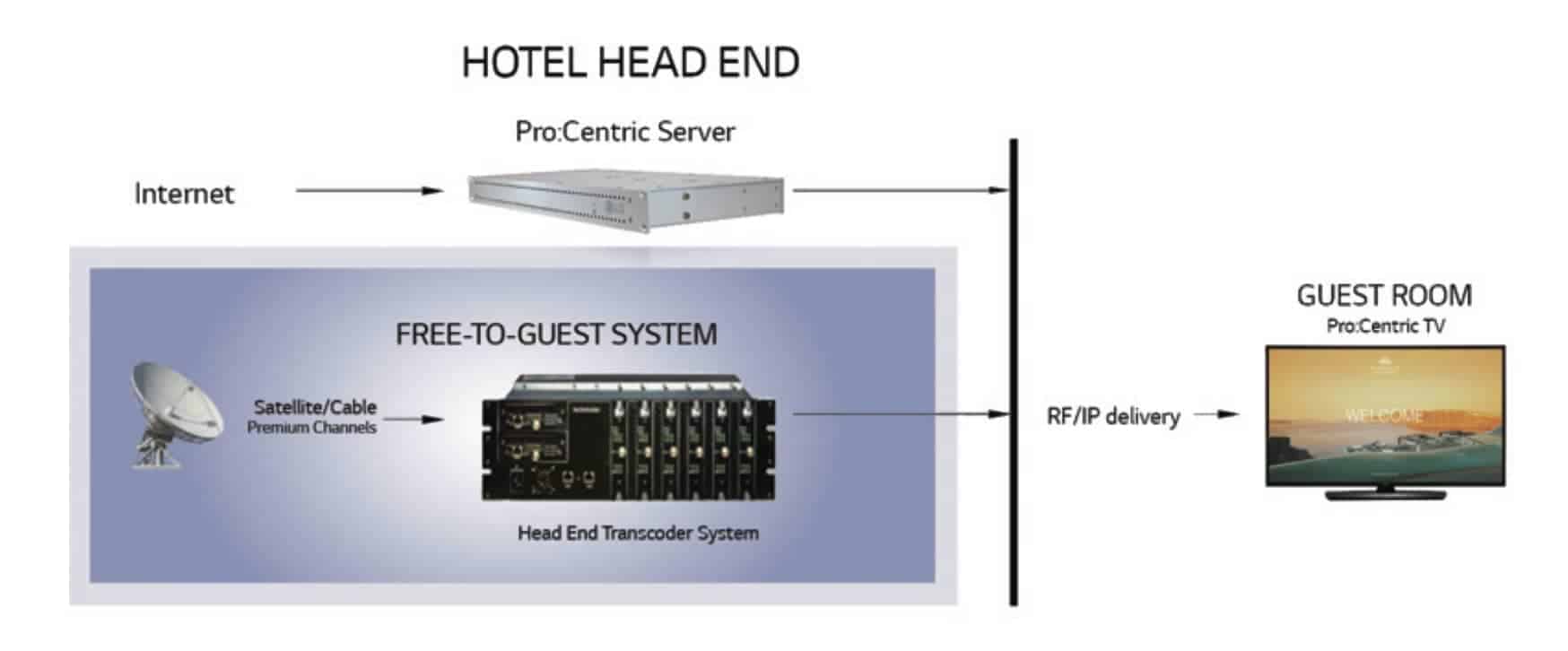 Pro:Centric сервер представляет собой унифицированное устройство, которое применяется в коаксиальных и в Ethernet сетях для дистанционного управления гостиничными телевизорами LG по сети. Корпус он имеет высоту 1U и монтируется в серверную инфраструктуру с минимальными эксплуатационными требованиями и внешним блоком питания на 19 Вт / 2.2 А. Сервер легко и быстро настраивается профессиональным обслуживающим персоналом с использованием специально разработанного программного обеспечения на основе ОС Linux. В целом устройство может поддерживать любое количество абонентов, но как показала практика комфортная работа в пределах до 300 абонентов. Несомненным преимуществом такого решения является его надежность в ходе дальнейшей эксплуатации потенциальными заказчиками. Возможность дистанционного управления устройством делает его удобным в повседневной работе и позволяет мгновенно реагировать на все требования посетителей гостиничных заведений. Дополнительно программное обеспечения включает в себя перечень сервисных инструментов, которые помогают обслуживающему персоналу постоянно мониторить состояние телевизионных устройств, осуществлять обновление программного обеспечения и получать сведения в режиме реального времени.