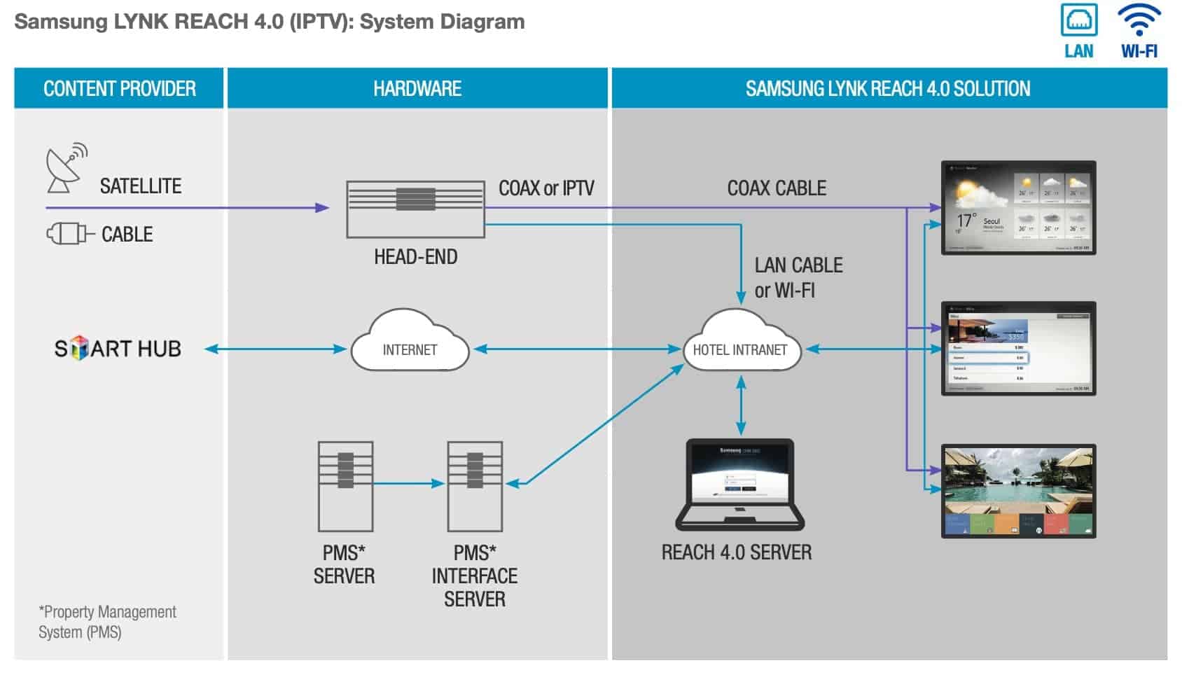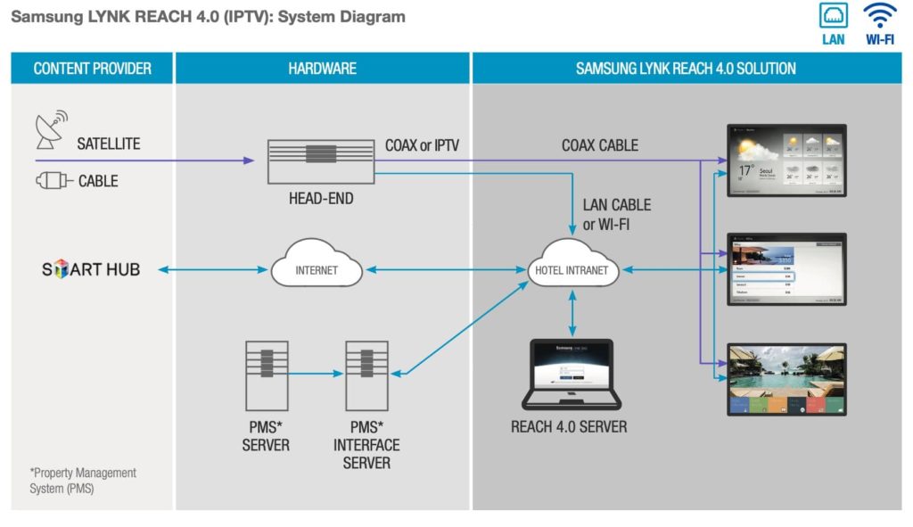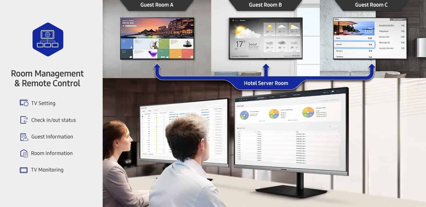 Решение Samsung LYNK REACH снижает общую стоимость владения для пользователей сферы гостеприимства за счет интеллектуальных функций, которые предоставляют отчеты о состоянии гостиничных номеров в реальном времени, и центральной платформы, с помощью которой ИТ-менеджеры могут удаленно управлять процессами. Отели могут выбирать отдельные телевизоры или группы телевизоров, контролировать параметры телевизора и сети, отображение информации о номерах и гостях, а также дистанционно оформлять регистрацию заезда / отъезда гостей. Эти возможности предоставляют отелям эффективный способ сэкономить время, силы и средства затрачиваемых на техническое обслуживание номеров, поскольку персоналу отеля не нужно посещать каждый номер отеля каждый раз, когда требуется смена настроек или контента.