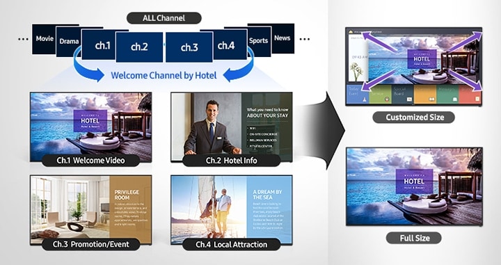 Решение LYNK REACH от Samsung предоставляет менеджерам отелей доступ к сочетанию IP-каналов и RF-каналов, создавая гибридную инфраструктуру каналов вещания, способную предложить гостям больше возможностей для развлечений и информации, чем на обычных телевизорах. Благодаря этим расширенным возможностям менеджеры отеля могут легко составить и активировать список каналов для удовлетворения уникальных потребностей гостей.